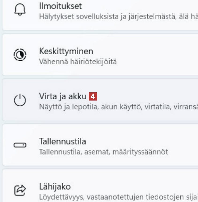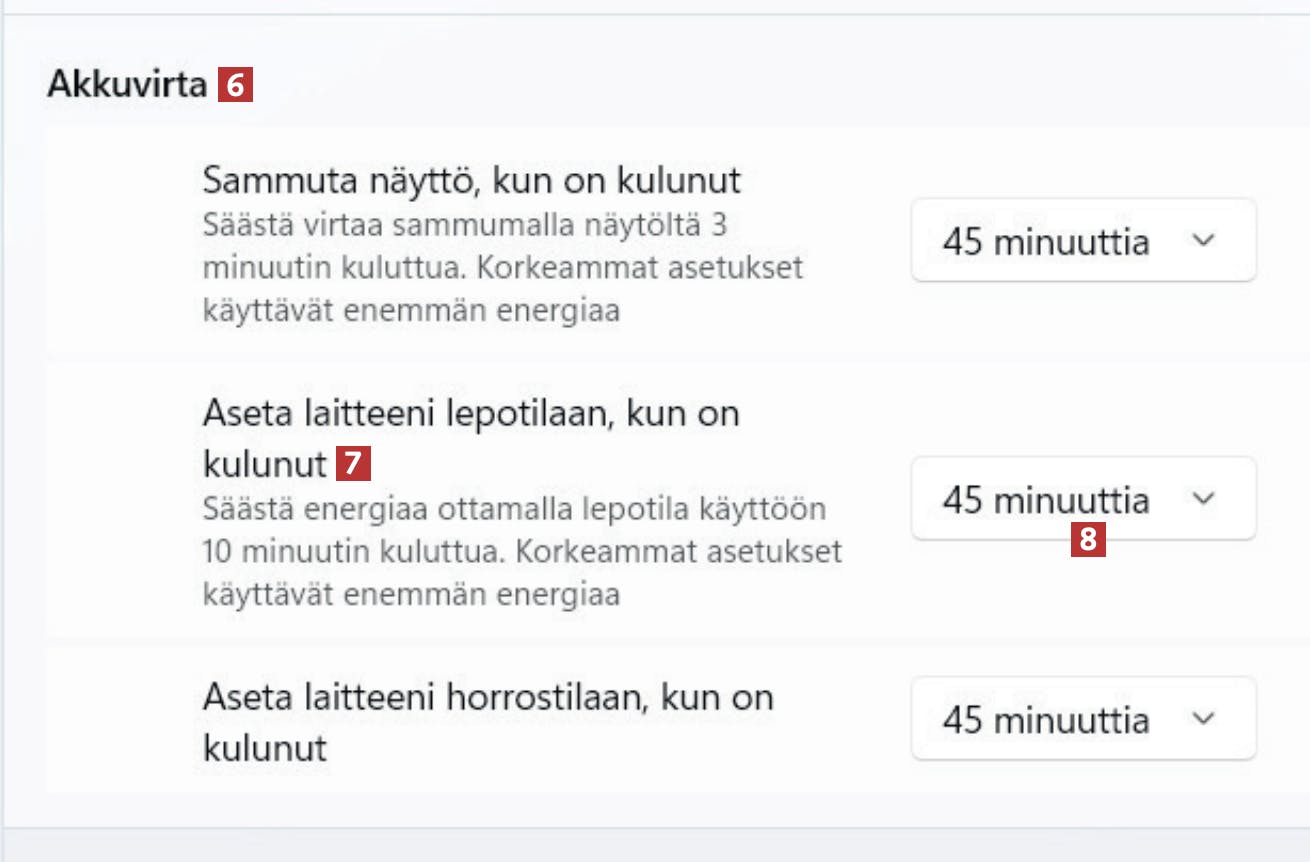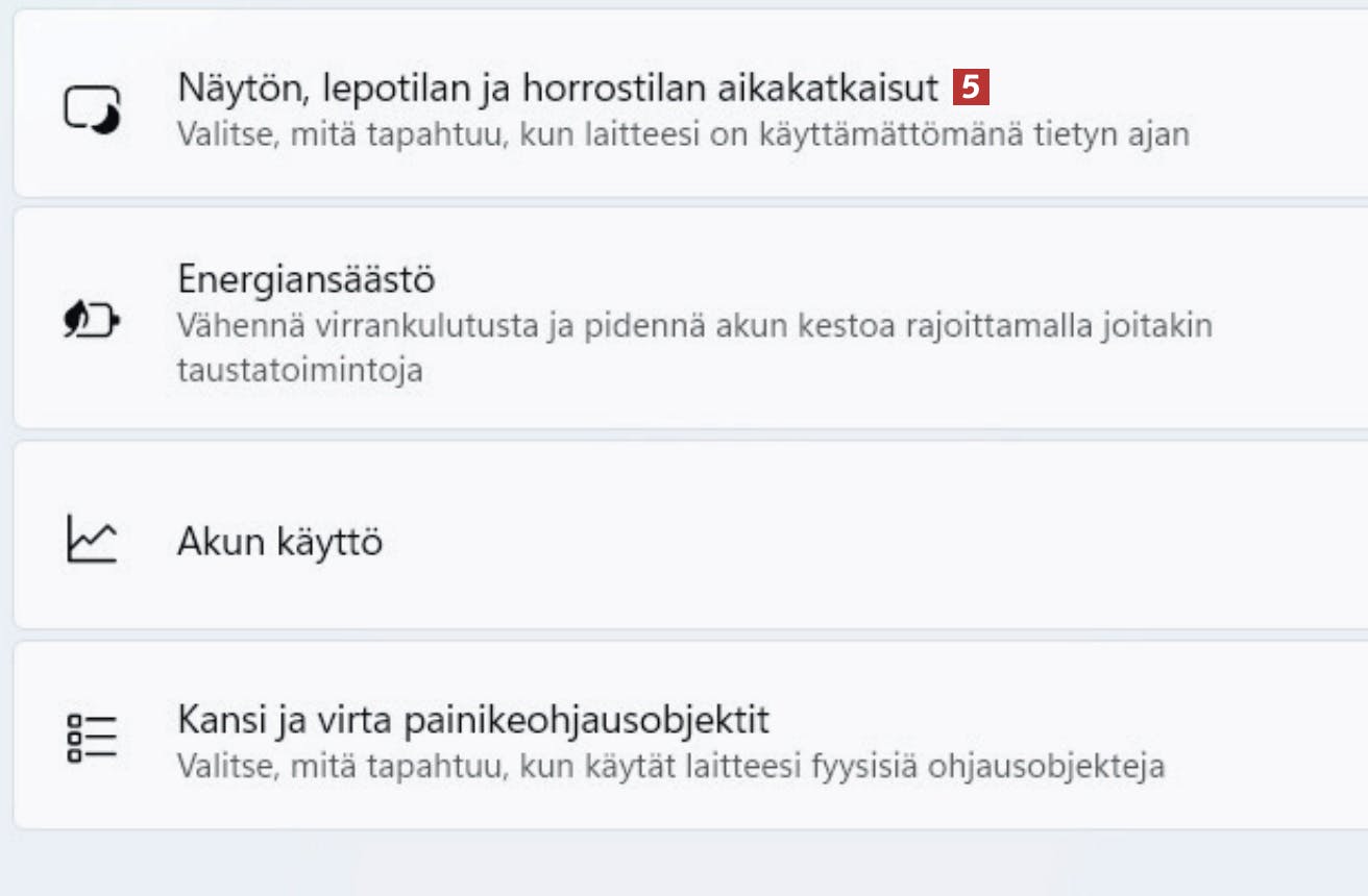 Oltuani poissa kannettavan Windows 11 -tietokoneeni luota muutaman minuutin jouduin käynnistämään sen uudelleen, koska Windows oli asettanut sen lepotilaan. Haluaisin, että se pysyisi auki pidempään, vaikka akun kestoaika lyhenisi. Miten tämä tehdään?