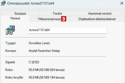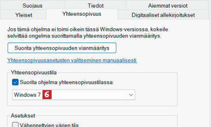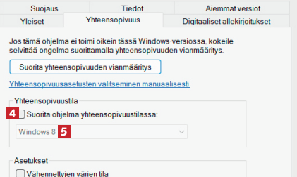 Ota käyttöön Suorita ohjelma yhteensopivuustilassa 4. Valitse se Windows-versio 5, jossa ohjelma on viimeksi toiminut.