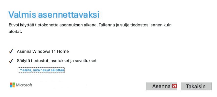 Valitse kohta Säilytä tiedostot, asetukset ja sovellukset 19 ja napsauta Seuraava-painiketta. Näin saat kaikki ohjelmat ja tiedostot siirrettyä Windows 11:een.