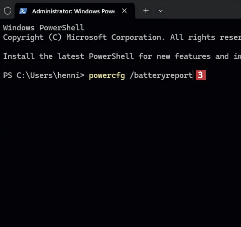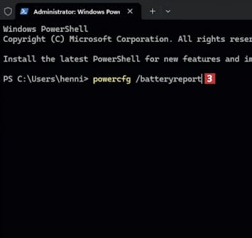 Kirjoita komentoriville powercfg /batteryreport (välilyönnillä ja kenoviivalla) 3 ja paina Enter-näppäintä. Windows kokoaa raportin tietokoneen akun kunnosta.