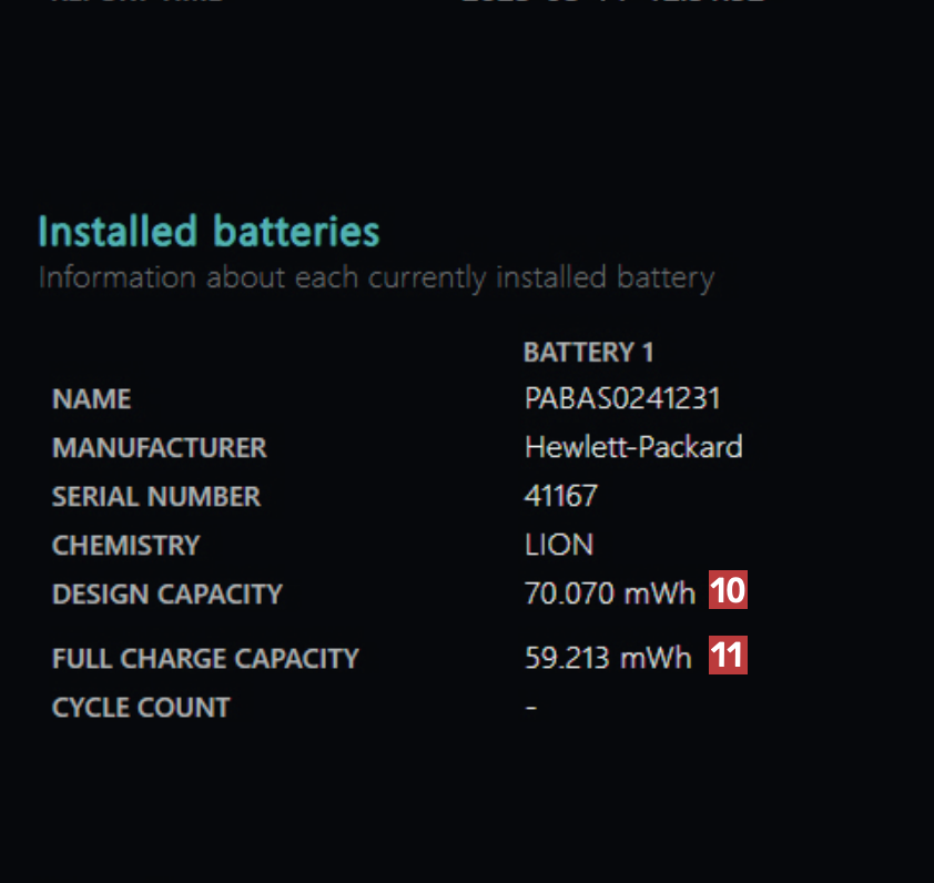 Akkuraportti avautuu selaimessa. Yläosassa näet heti, mikä akun kapasiteetti oli uutena 10 ja mikä sen kapsiteetti on nyt 11.