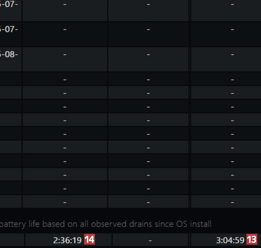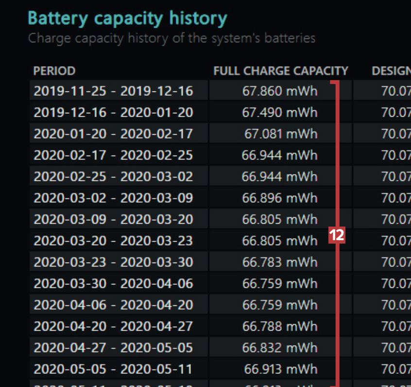 Selaamalla raporttia hiirellä alaspäin näet lisätietoja siitä, kuinka akun kapasiteetti on heikentynyt vuosien mittaan 12.