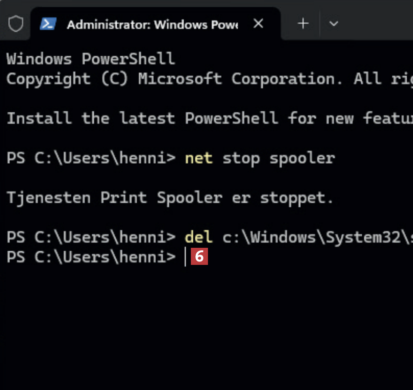 Hetken kuluttua näet jälleen tyhjän komentorivin 6. Jono on tyhjennetty, ja kaikki odottavat tulostustyöt on poistettu.