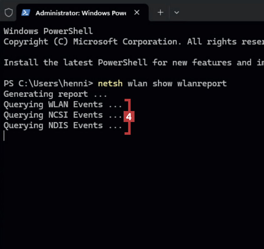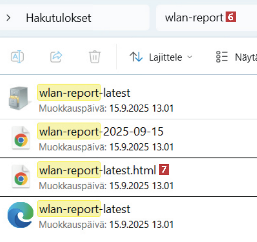 Avaa Resurssienhallinta ja kirjoita hakukenttään wlan-report 6. Odota hetki. Kaksoisnapsauta tiedostoa wlan-report-latest.html 7.
