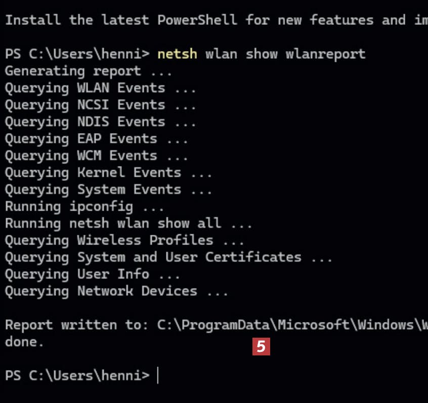 Näet, että Windows on tallentanut raportin kansioon c:\ ProgramData\Microsoft\Windows\ WlanReport 5. Sulje ikkuna.