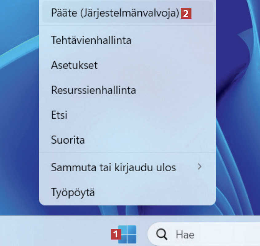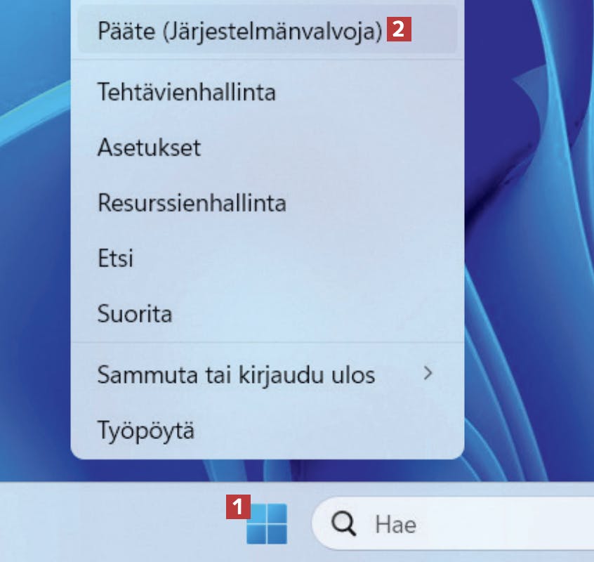 Napsauta aloitusta 1 hiiren oikealla ja valitse Pääte (Järjestelmänvalvoja) 2. Windows 10:ssä valitaan puolestaan Windows PowerShell (admin).