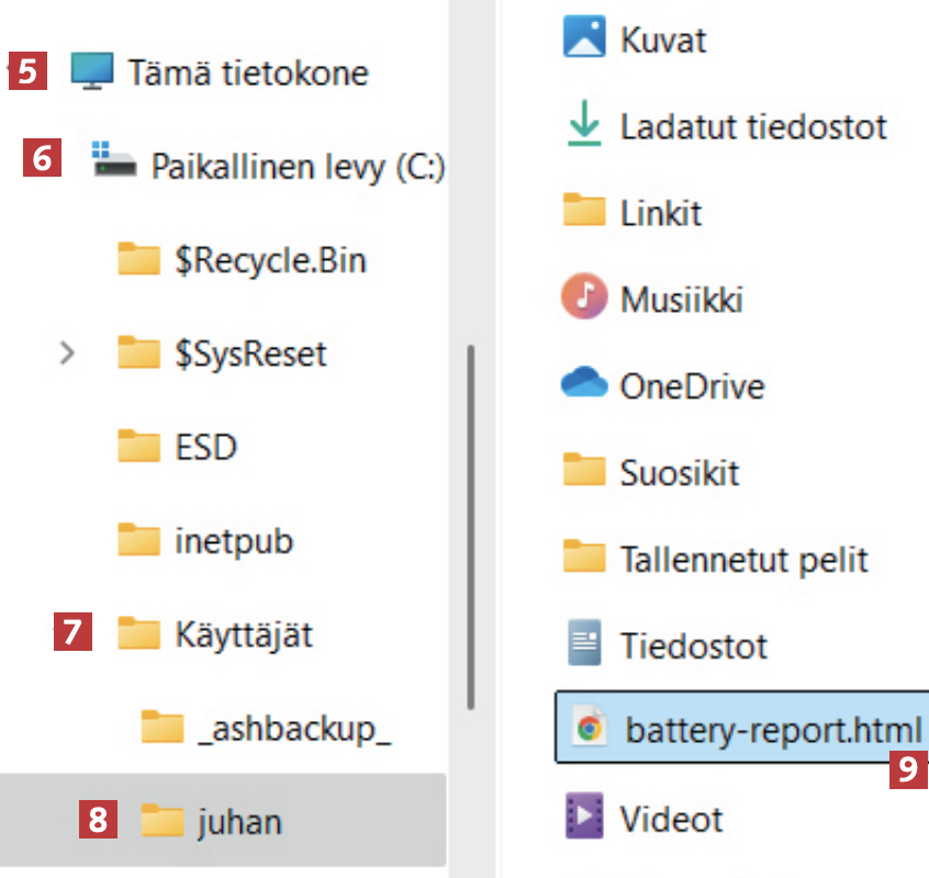 Avaa Resurssienhallinta. Valitse Tämä tietokone 5, Paikallinen levy (C:)6, Käyttäjät 7 ja käyttäjänimesi 8. Kaksoisnapsauta tiedostoa battery-report.html 9.