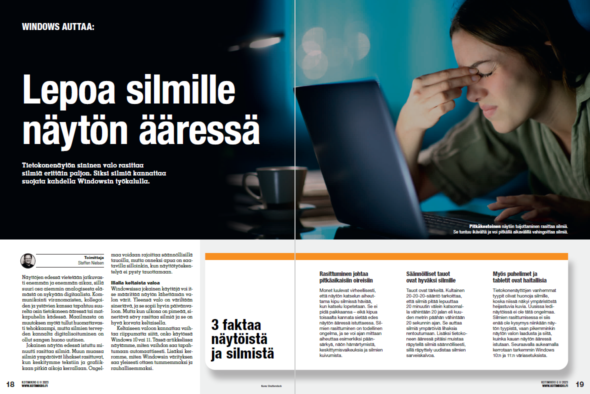Windows 10 Lepoa silmille näytön ääressä Tietokonenäytön sininen valo rasittaa silmiä erittäin paljon. Siksi silmiä kannattaa suojata kahdella Windowsin työkalulla.