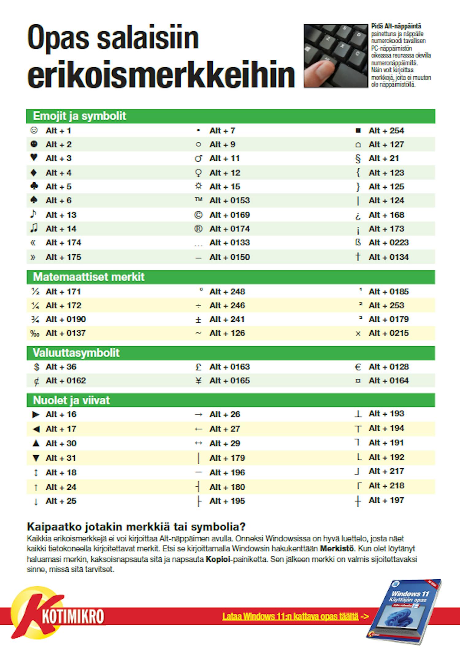 Oppaastamme löydät monia muita erikoismerkkejä, joiden koodien tuntemisesta on myös hyötyä.
