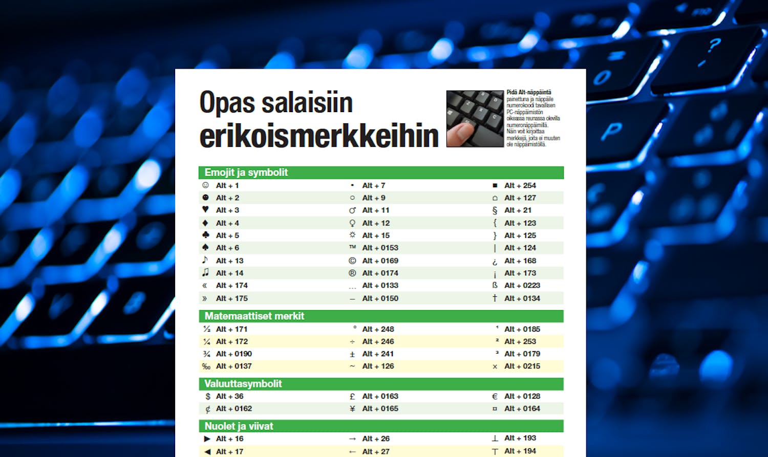 Kun pidät ALT-näppäintä painettuna samalla kun syötät numerokoodin numeronäppäimistöllä, voit lisätä useita erikoismerkkejä, jotka ovat muuten hankalasti löydettävissä.