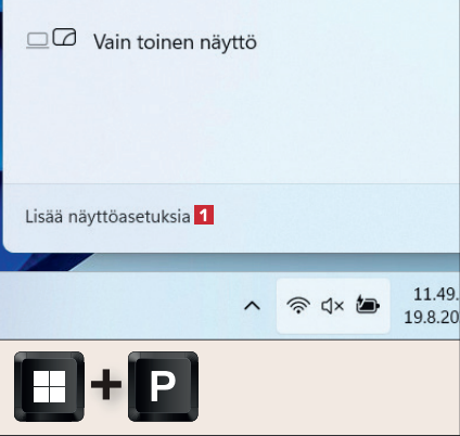 Liitä näyttö koneeseen ja paina näppäimistön Windows-näppäintä ja P:tä. Napsauta seuraavaksi avautuvasta ikkunassa kohtaa Lisää näyttöasetuksia 1.