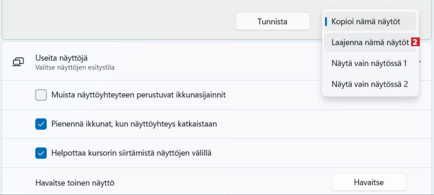 Valitse sitten, haluatko näyttöjen toimivan toistensa jatkeena vai kopiona. Jos laajennat näytöt toistensa jatkeeksi, voit siirtää työpöydällä auki olevia ikkunoita nätöltä toiselle.