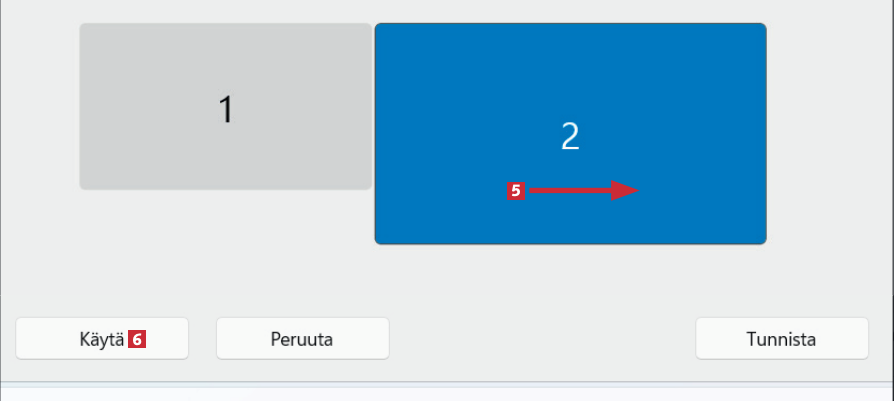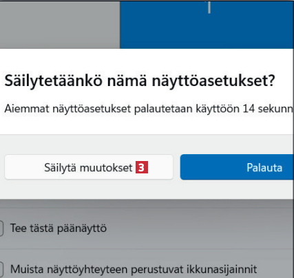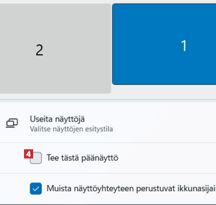 Ensisijainen näyttö on sininen. Mikäli haluat vaihtaa näytön ensisijaiseksi, napsauta sitä ja valitse sitten Tee tästä päänäyttö 4.