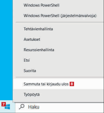Napsauta aloituspainiketta 7 ja valitse Sammuta tai kirjaudu ulos 8 sekä sen jälkeen Käynnistä uudelleen.