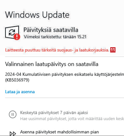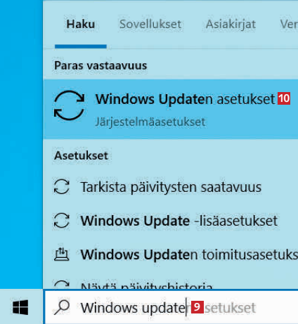Kun laite käynnistyy uudelleen, kirjoita hakukenttään Windows Update 9 ja napsauta kohtaa Windows Updaten asetukset 10.