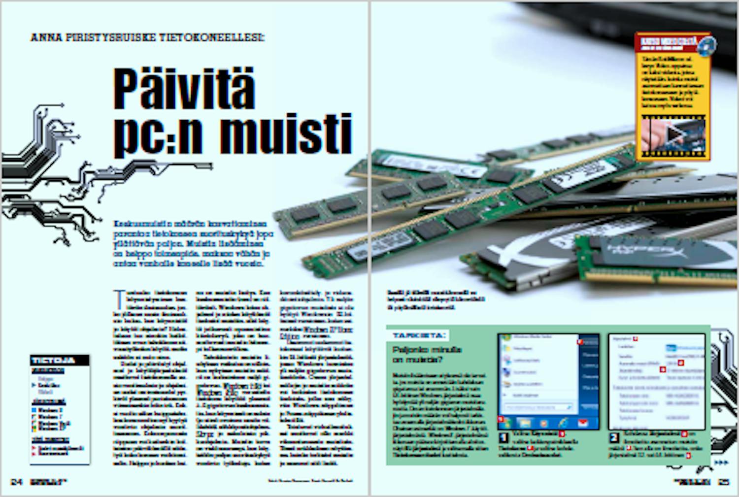 Kaksi vuotta sitten huipputehokas kone saattaa nyt hyytyä vaativia ohjelmia suorittaessaan. Kokoonpanosta riippuen voi kuitenkin laitteistoa päivittämällä säästyä koko koneen vaihtamiselta. Helppo ja huokea keino on muistin lisäys. Kun keskusmuistia (ram) on riittävästi, Windows lataa ohjelmat ja niiden käyttämät tiedostot muistiin, eikä käytä jatkuvasti apumuistina kiintolevyä, joka on huomattavasti muistia hitaampi tallennusväline. Tehokkainta muistin lisäyksen vaikutus on silloin, kun nykyisen muistin määrä on korkeintaan neljä gigatavua.