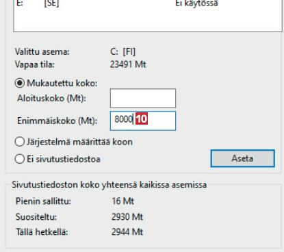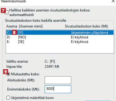 Poista valinta kohdasta Hallitse kaikkien asemien sivutustiedostojen kokoa automaattisesti 7. Napsauta järjestelmäasemaa (yleensä C:) 8 . Valitse Mukautettu koko: 9.