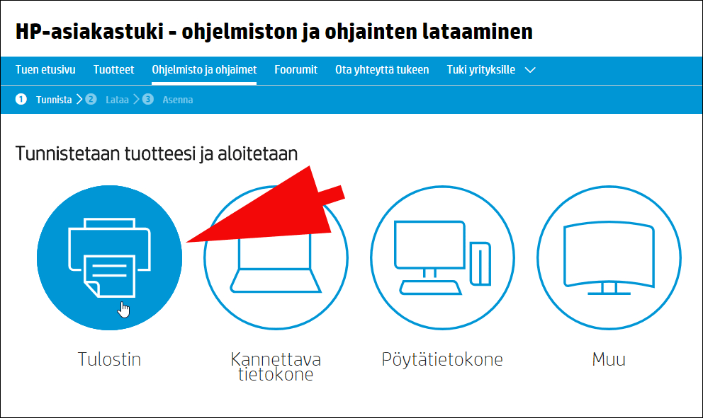 Siirry HP:n tukisivustolle, valitse aloitussivulla Tulostin ja kirjoita tulostimesi malli, niin tukisivun ohjattu toiminto hakee ajuripaketin, jos sellainen on saatavilla.