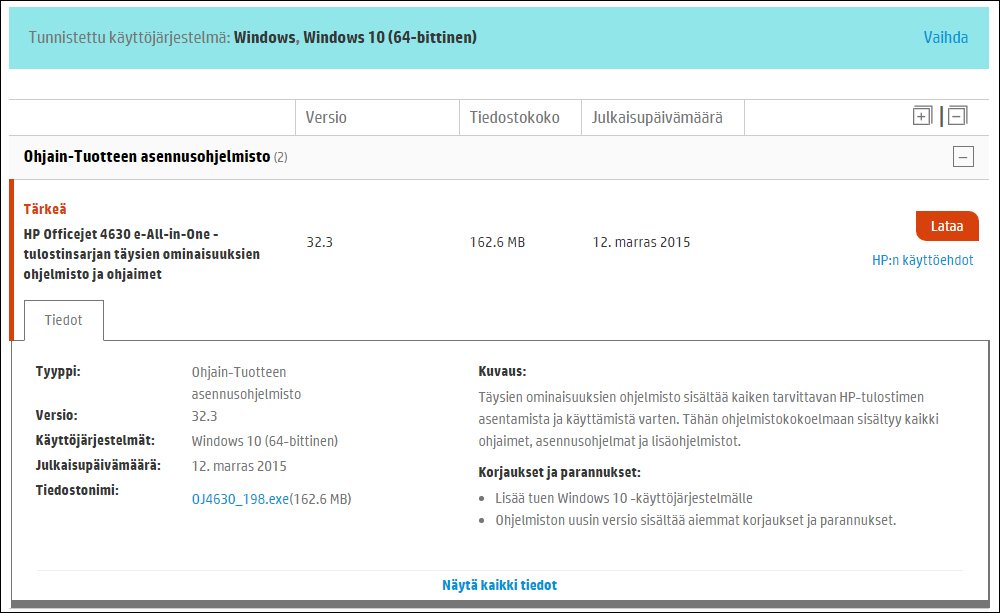 - Jos laitteelle on saatavana ajuri, esiin tulee lataussivu, jolta voi ladata asennusohjelmiston. Käynnistä lataus valitsemalla Lataa. Käynnistä ajurin asennus kaksoisnapauttamalla lataamaasi tiedostoa Ladatut tiedostot -kansiossa.
