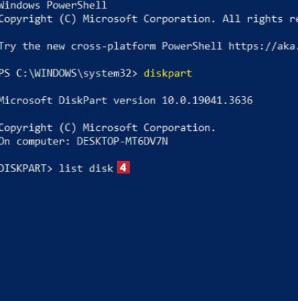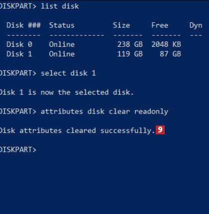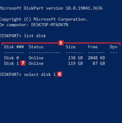 Näet luettelon laitteista 5. Kirjoita select disk 1 6 (korvaa numero 1 tikun levykirjaimella 7 luettelossa). Paina Enter-näppäintä.
