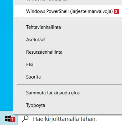 Liitä usb-tikku tietokoneeseen. Napsauta aloitusta 1 hiiren oikealla. Valitse Windows PowerShell (Järjestelmänvalvoja) 2.