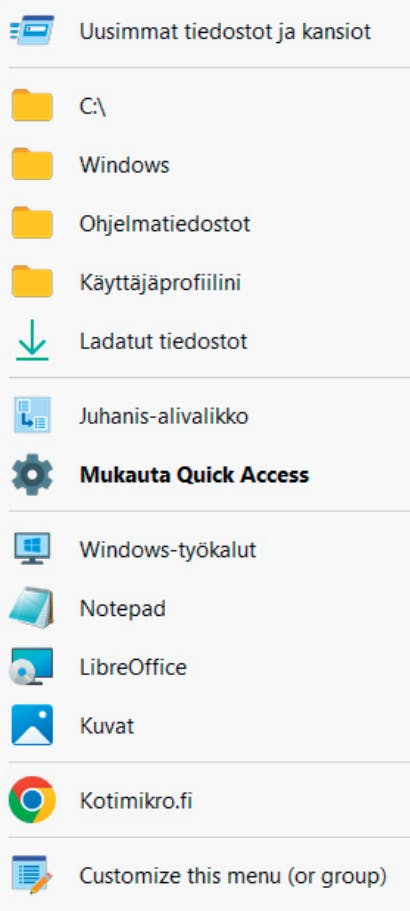 Lataa Quick Access Popup - sovellus verkkosivustoltamme. Asenna se ja sulje ohjelmaikkuna. Paina hiiren keskipainiketta. Pikavalikko avautuu työpöydälle. Voit muokata sitä napsauttamalla aivan aluksi kohtaa Customize this menu (or group) 1.