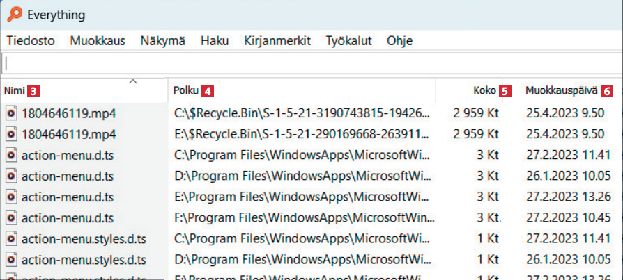 Tiedosto löytyy Everything-ohjelman avulla helposti, vaikka sen nimi olisi unohtunut. Kunhan tiedoston tyyppi on tiedossa, ohjelman voi asettaa etsimään koneelta vain kyseistä tiedostotyyppiä, vaikkapa videoita.