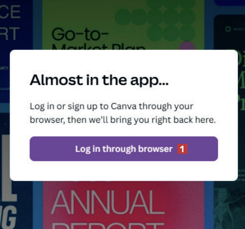 Aloita lataamalla Canva verkkosivuiltamme ja asenna ohjelma. Avaa Canva. Näet tämän ikkunan. Napsauta seuraavaksi painiketta Log in through browser 1.