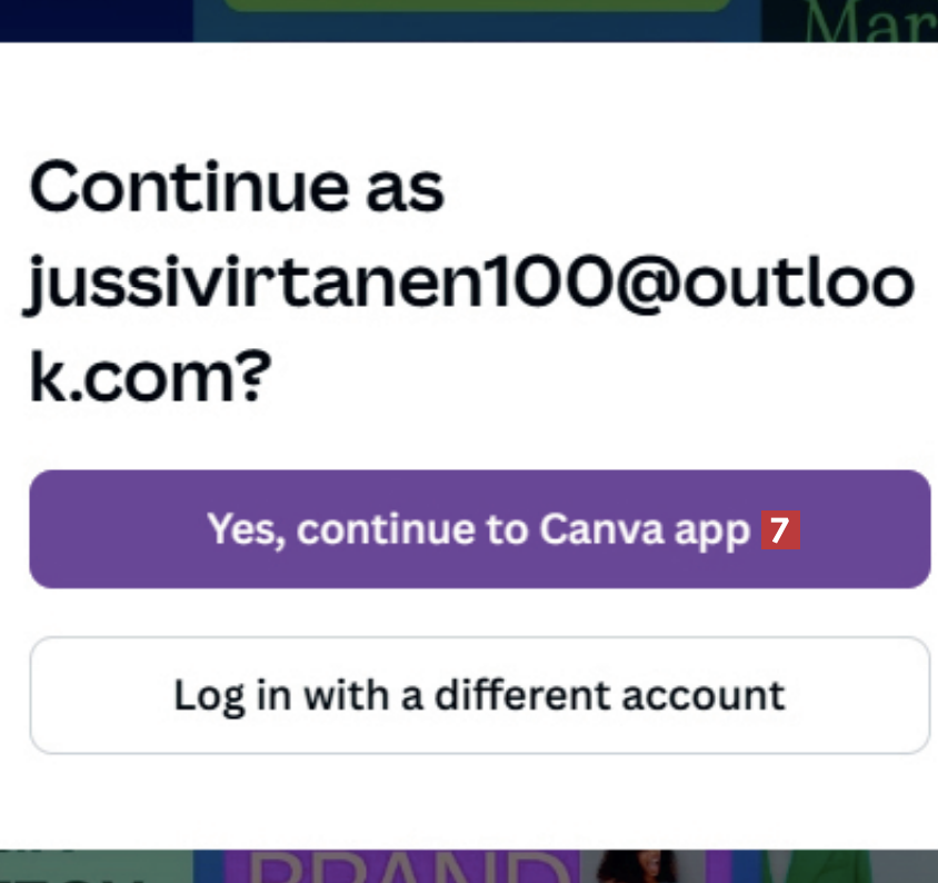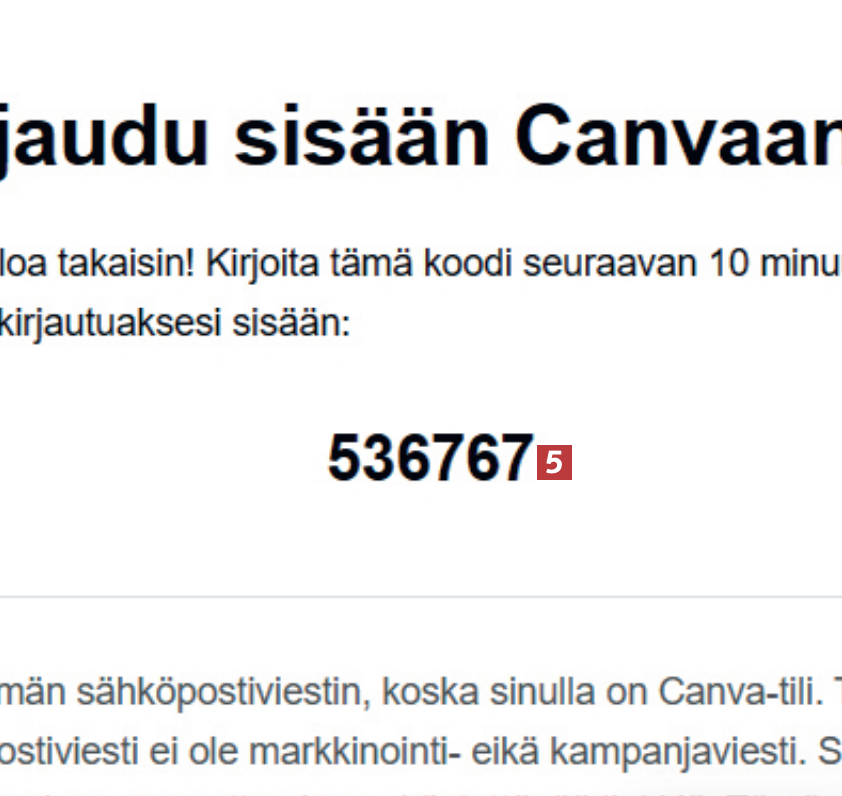 Avaa juuri syöttämäsi sähköpostiosoitteen postilaatikosta Canvan sähköpostiviesti. Kopioi viestissä oleva koodi 5 leikepöydälle tai kirjoita se ylös.