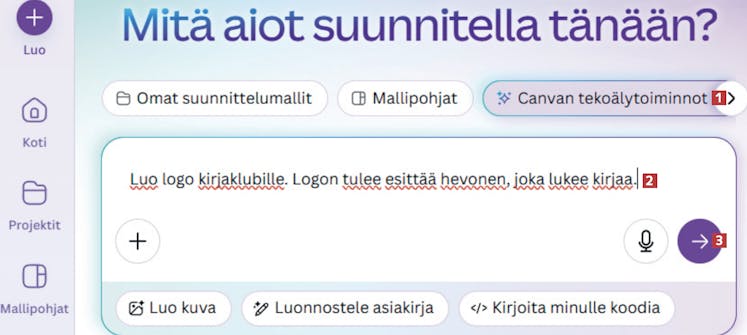 Avaa Canva ja valitse päävalikosta Canvan tekoälytoiminnot 1. Kirjoita tekstikenttään kehote, josta käy ilmi, mitä logosi tulee esittää 2. Samaan kenttään voit tarvittaessa kirjoittaa robotille lisäohjeita. Napsauta lopuksi nuolta 3. Canva alkaa muodostaa logoa.