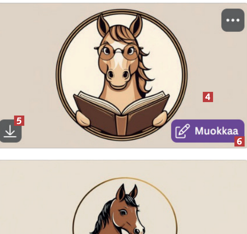 Canva tekee neljä logoehdotusta. Vie hiiri parhaan ehdotuksen päälle 4. Tallenna se napsauttamalla tästä 5, jos olet tyytyväinen. Valitse Muokkaa 6, jos haluat muokata sitä.