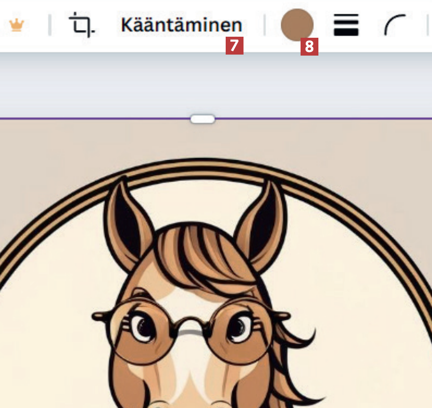 Valittu logo avautuu Canvan muokkaustyökalussa, ja voit tehdä siihen haluamiasi muutoksia. Voit esimerkiksi kääntää sen peilikuvaksi 7 tai muuttaa värejä 8.