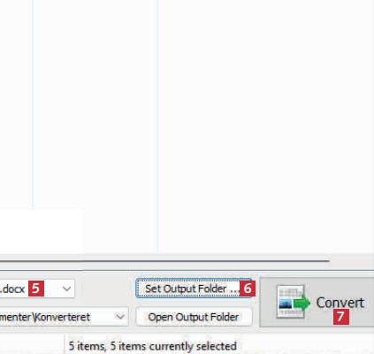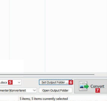 Valitse tiedostomuoto .docx 5 ja napsauta kohtaa Set Output Folder… 6 valitaksesi kansion, johon tiedostot tallennetaan. Napsauta sitten kohtaa Convert 7 aloittaaksesi.
