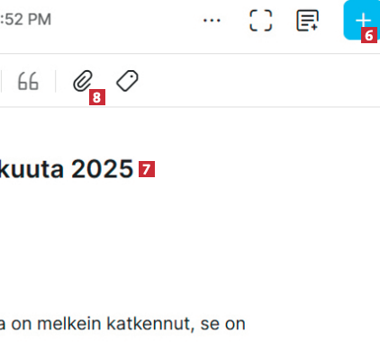 Luo päiväkirjaan uusi sivu napsauttamalla +-merkkiä 6. Ohjelma muuttaa automaattisesti ensimmäisen rivin otsikoksi 7. Jos haluat lisätä kuvan, napsauta paperiliitintä 8.