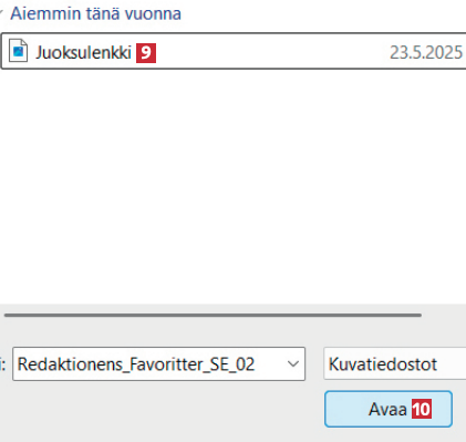 Merkitse kuvasi 9 ja napsauta kohtaa Avaa 10. Kun olet tehnyt tämän, kuva lisätään tekstiisi. Kuva täyttää koko tekstikentän leveyden.