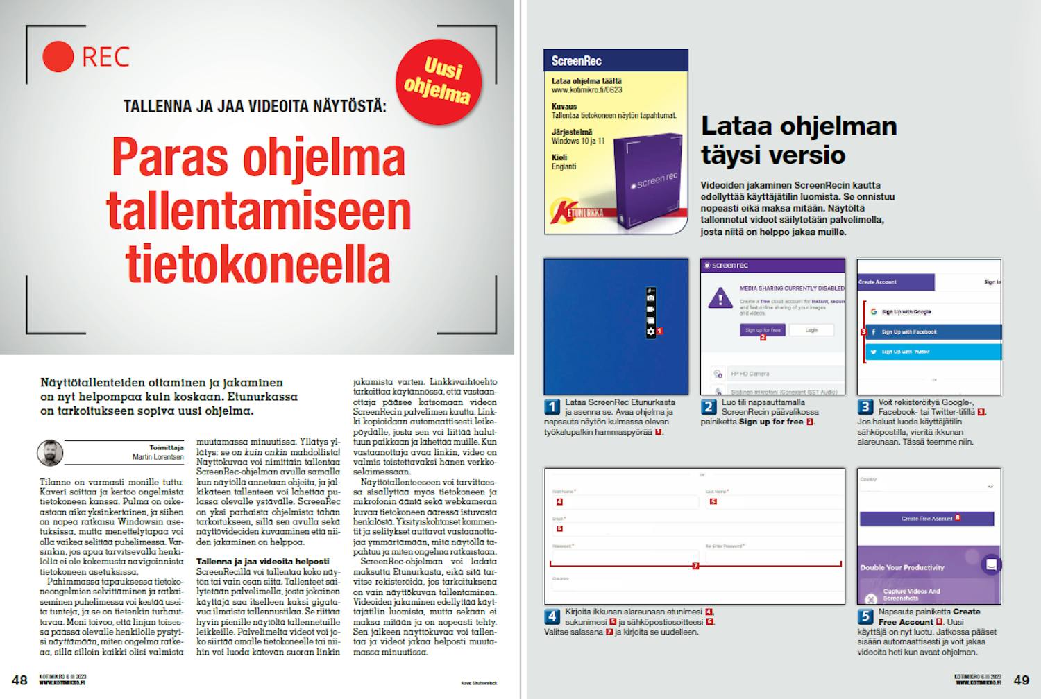 Näyttötallenteeseen voi tarvittaessa sisällyttää myös tietokoneen ja mikrofonin ääntä sekä webkameran kuvaa tietokoneen ääressä istuvasta henkilöstä. Yksityiskohtaiset kommentit ja selitykset auttavat vastaanottajaa ymmärtämään, mitä näytöllä tapahtuu ja miten ongelma ratkaistaan. ScreenRec-ohjelman voi ladata maksutta Etunurkasta, eikä sitä tarvitse rekisteröidä, jos tarkoituksena on vain näyttökuvan tallentaminen. Videoiden jakaminen edellyttää käyttäjätilin luomista, mutta sekään ei maksa mitään ja on nopeasti tehty. Sen jälkeen näyttökuvaa voi tallentaa ja videot jakaa helposti muutamassa minuutissa.