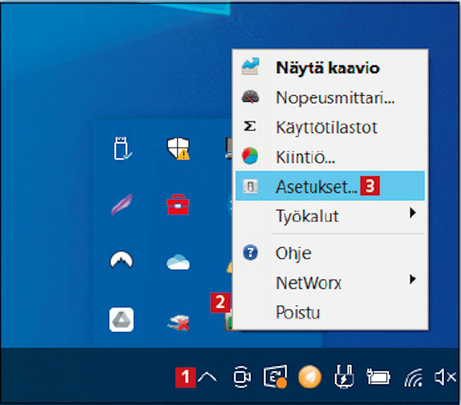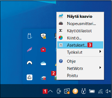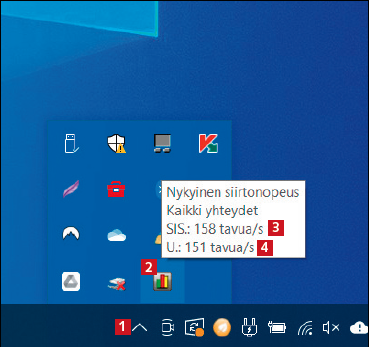 Kun NetWorx on asennettu, ohjelma toimii aina Windowsin taustalla ja valvoo verkkoyhteyttä. Sen avulla on helppo selvittää, kuinka paljon yhteyttä käytetään juuri nyt.