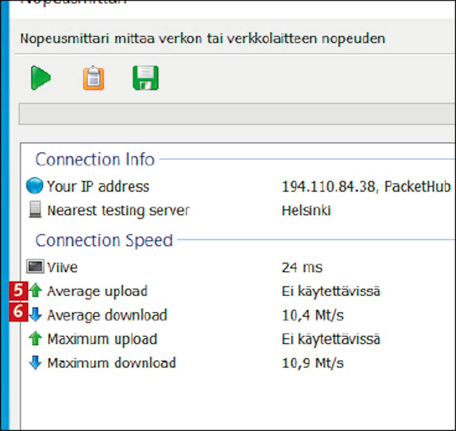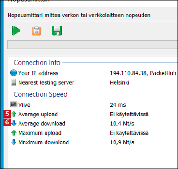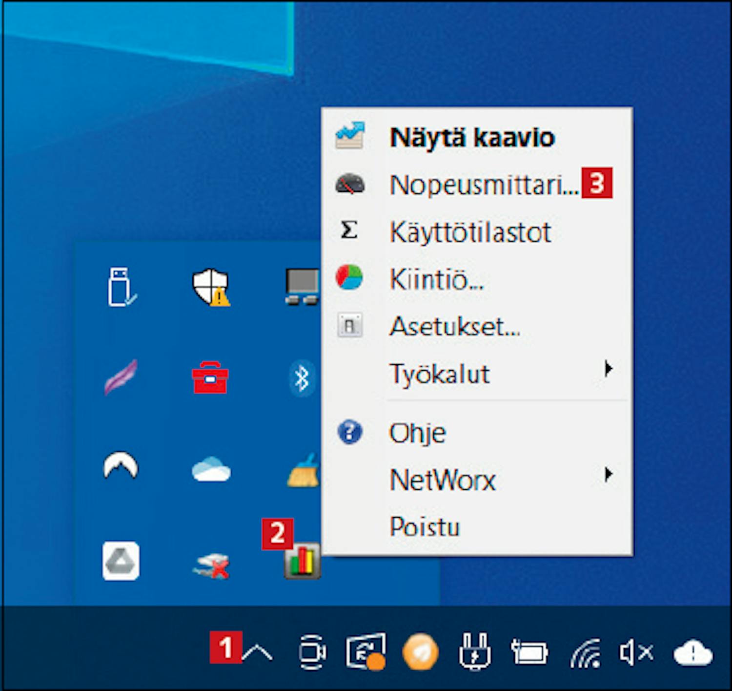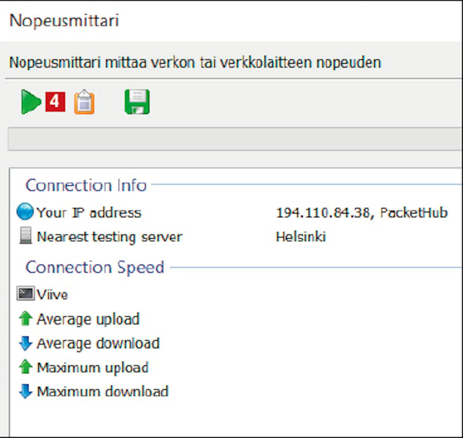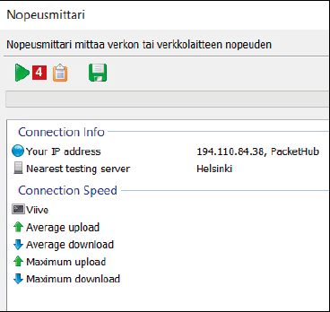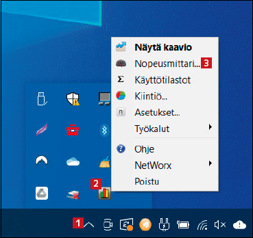 NetWorxissa on sisäinen nopeusmittari, jonka avulla voi nopeasti testata, onko yhteys riittävän nopea. Mittariin pääsee suoraan kohdevalikosta.