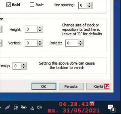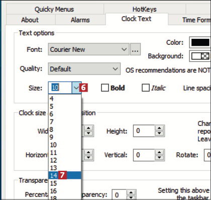 Yksi T-Clockin kätevimmistä toiminnoista on käytettävissä Clock Text -kohdassa. Siellä voit esimerkiksi valita fontin, suurentaa fonttia, lisätä taustavärin, muuttaa fontin väriä, lihavoida tekstiä ja paljon muuta. Seuraavassa näytämme, miten suurennat tekstiä ja vaihdat sen värin.