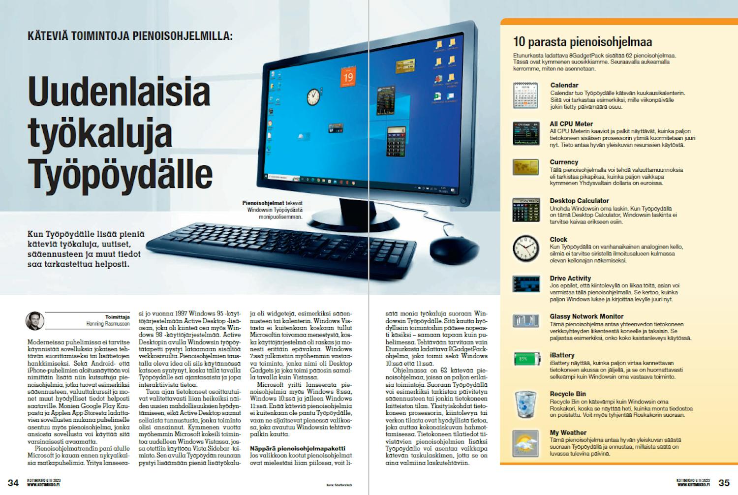 Jos valikkoon kootut pienoisohjelmat ovat mielestäsi liian piilossa, voit lisätä monia työkaluja suoraan Windowsin Työpöydälle. Sitä kautta hyödyllisiin toimintoihin pääsee nopeasti käsiksi – samaan tapaan kuin puhelimessa. Tehtävään tarvitaan vain Etunurkasta ladattava 8GadgetPackohjelma, joka toimii sekä Windows 10:ssä että 11:ssä.