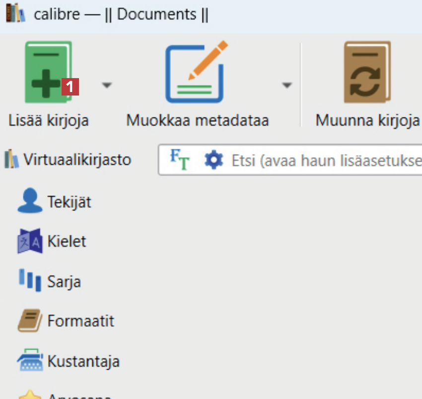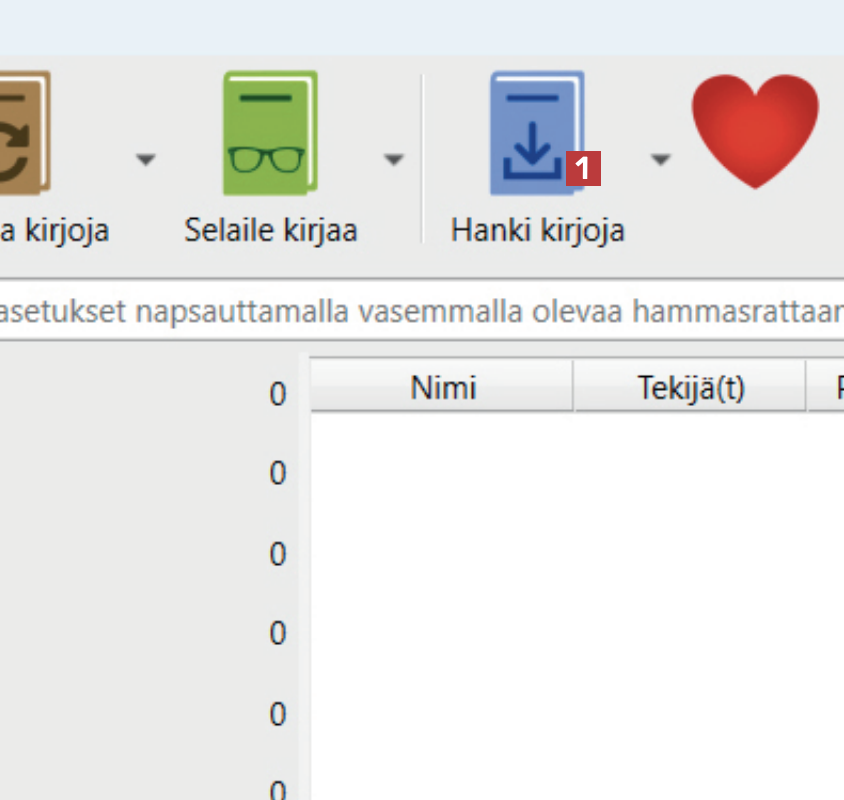 Aloita lataamalla Calibre verkkosivustoltamme ja asentamalla ohjelma. Avaa Calibre ja napsauta kohtaa Hanki kirjoja 1 ohjelman yläosassa sijaitsevalla työkalurivillä.