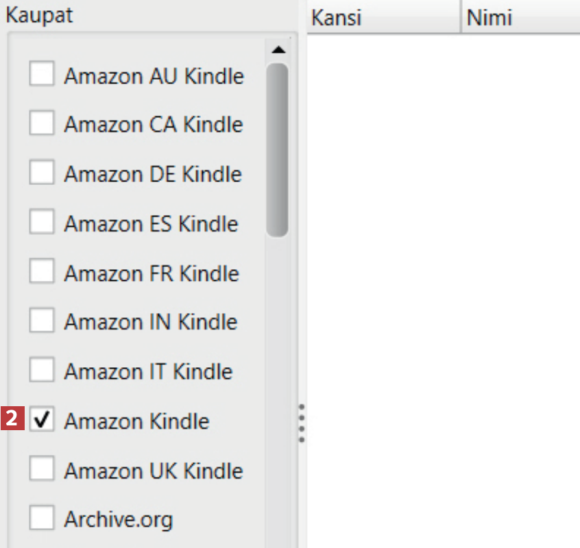 Valitse vasemmalla Kaupatluettelossa ne kaupat 2, joista haluat ostaa e-kirjoja. Tämän jälkeen hakutuloksia näytetään vain valituista verkkokaupoista.
