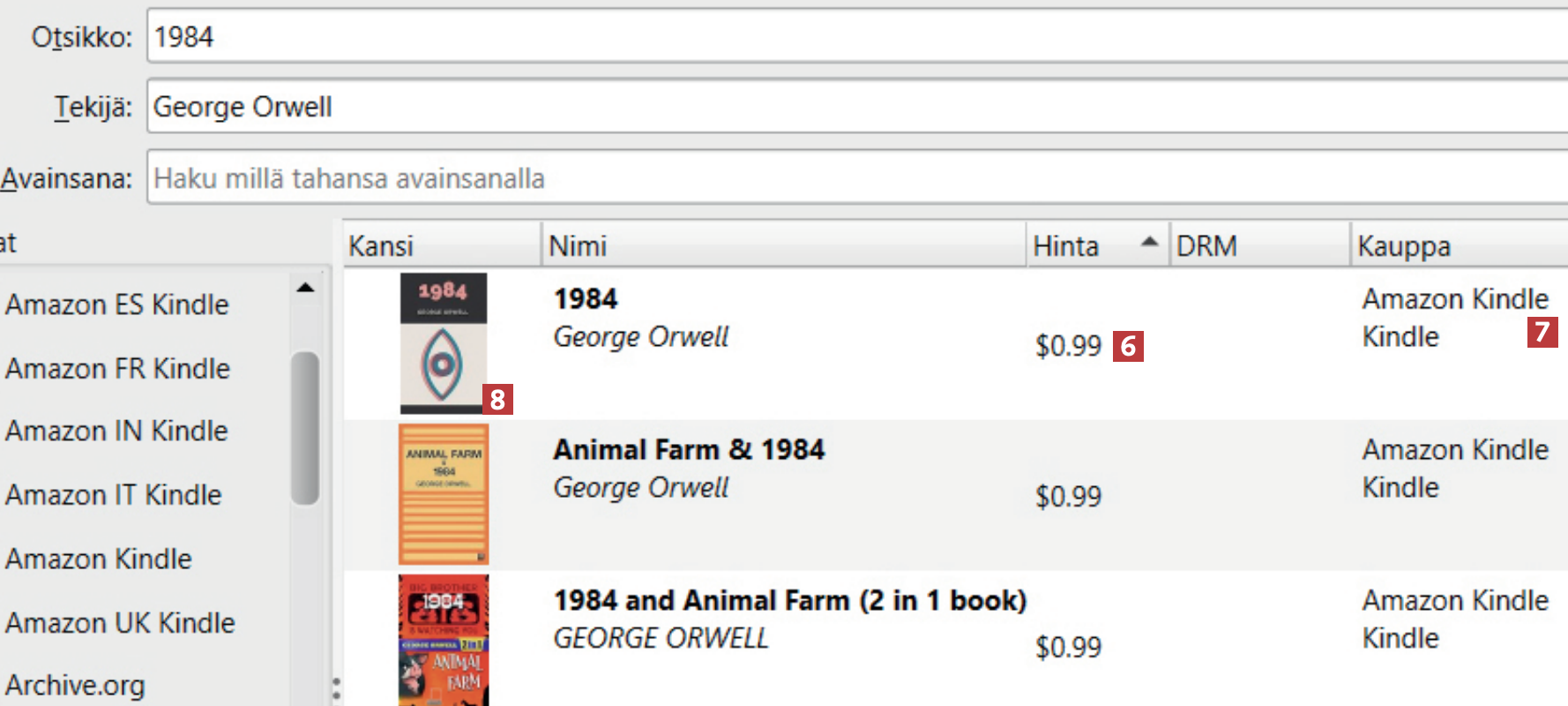 Näet kaikki hakutulokset niistä e-kirjakaupoista, jotka olet valinnut. Näet hinnan omasta sarakkeestaan 6, ja oikealla näet, mistä kaupasta 7 e-kirja on ostettavissa. Jos löydät etsimäsi, kaksoisnapsauta kirjan kuvaa 8. Jos e-kirja on ilmainen, voit ladata sen suoraan Calibreen. Lue ohjeet kohdasta Lataa lukuisia ilmaisia e-kirjoja.