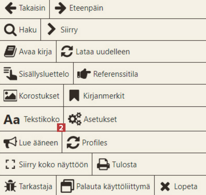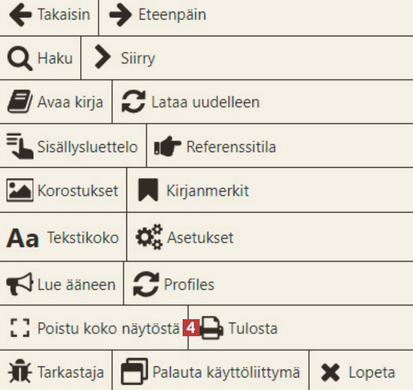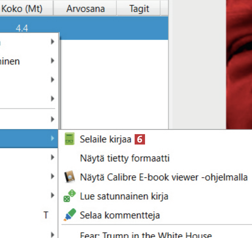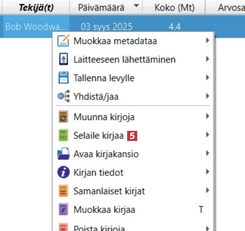 Napsauta uudessa valikossa kohtaa Selaile kirjaa 6. Voit käyttää myös V-näppäintä pikavalintana avataksesi e-kirjan.