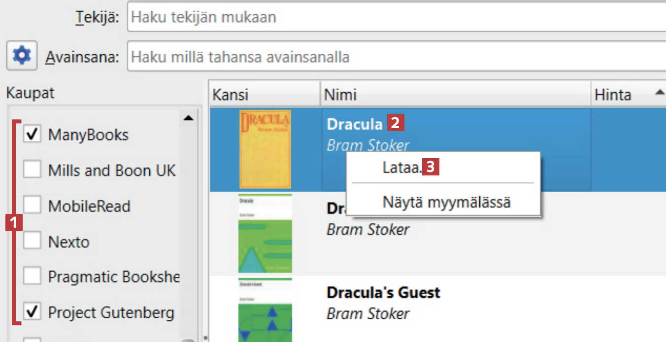 Voit ladata e-kirjoja tietokoneellesi Calibren tietokannasta. Ilmaiset e-kirjat voit ladata suoraan ohjelmasta, mutta jos haluat ostaa e-kirjan, sinut ohjataan sivustolle, jossa kirja on myynnissä. Toimi seuraavasti: