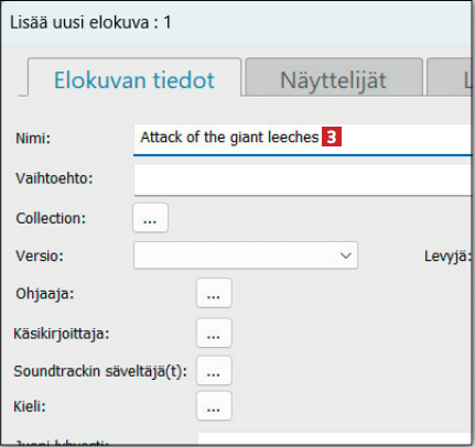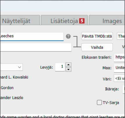 Kaikki elokuvaa koskevat kentät täytetään automaattisesti, ja ohjelma lisää kansikuvankin. Napsauta välilehteä Lisätietoja 5 .