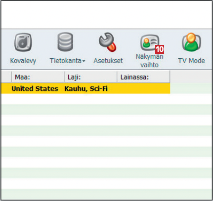 Tietokannassa on nyt yksi elokuva. Elokuvat näkyvät oletusarvoisesti luettelona, mutta niitä voi tarkastella myös kansikuvina hyllyllä. Napsauta Näkymän vaihto 10.