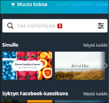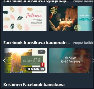 Facebook-profiili kaipaa ehkä yläreunan koristeeksi uuden ja entistä ehomman taustakuvan, ja sen saa tehtyä Canvalla hetkessä. Valitse vain ensin jokin Facebookin taustakuvaksi tarkoitettu mallipohja ja muokkaa siitä sitten yksilöllisempi omalla kuvalla ja valinnaisella tekstikatkelmalla.
