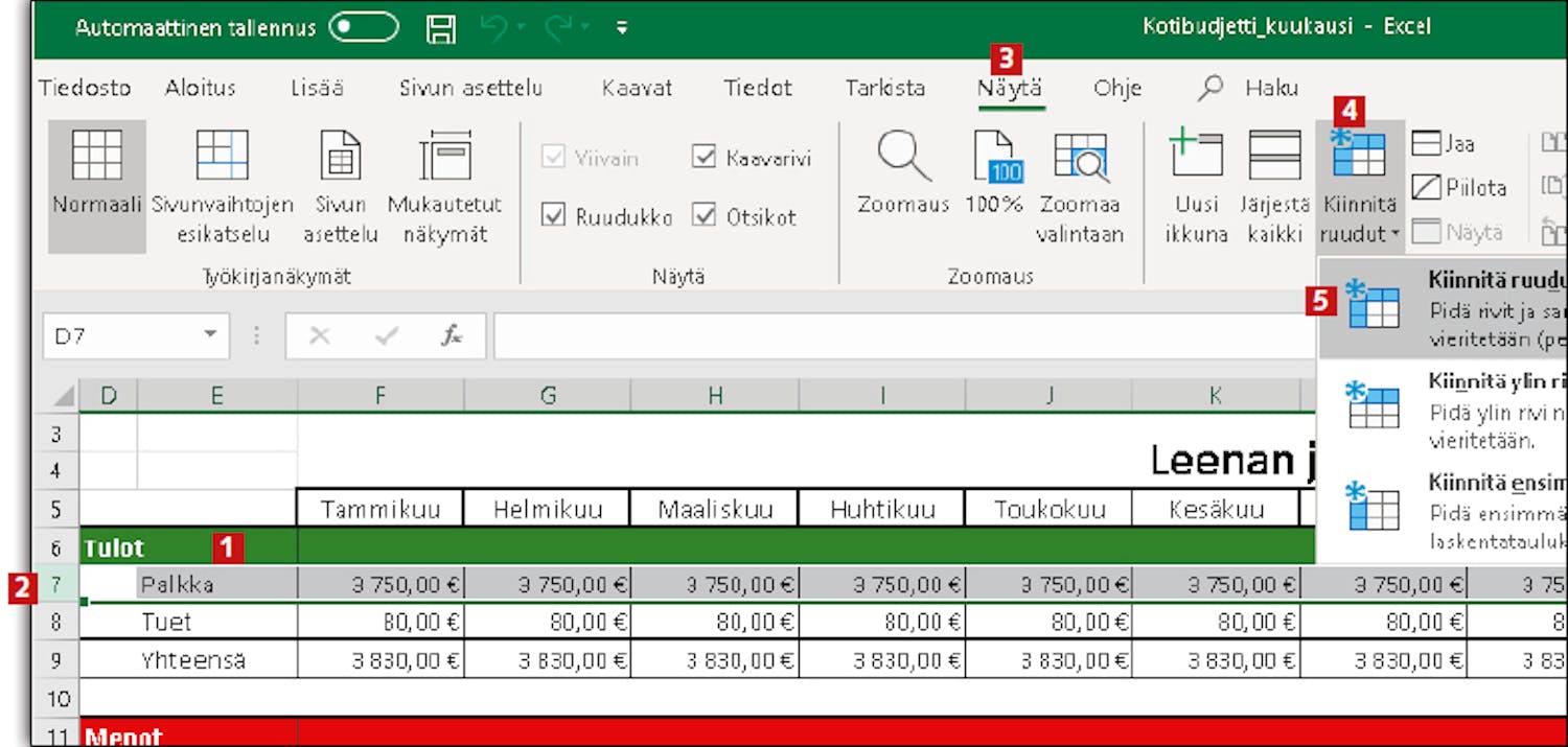 Excelin Kiinnitä ruudut -toiminnon.