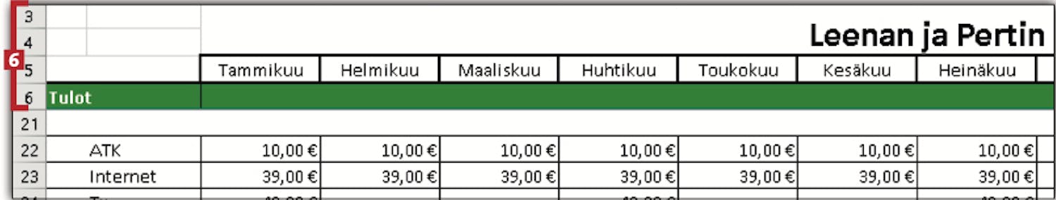 näkyvissä, koska rivit on kiinnitetty 6-rivistä ylöspäin 6.